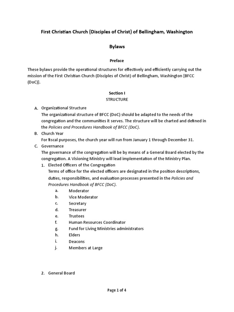 Bellingham First Christian Church Bylaws Christian Church (Disciples Purpose Of Church Bylaws They outline the legal structure of the. to start writing church bylaws, conduct thorough research, review existing bylaws, and consult with church leadership. Define your church’s purpose and structure, establish membership guidelines, outline financial policies, and address worship services and conflict resolution. church bylaws play a vital role in providing clarity and guidance for a church’s members, leaders,. Purpose Of Church Bylaws.